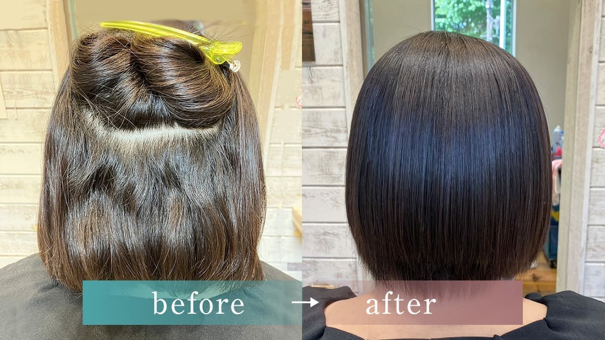 通常は熱を加えると固くなる髪質が、メテオパーマをすると手触りが柔らかくサラサラになりツヤのある仕上がりになります。